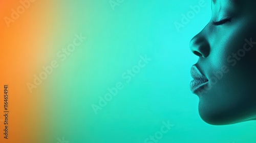 Close-up profile of a woman with closed eyes on a gradient background blending orange and teal hues.
