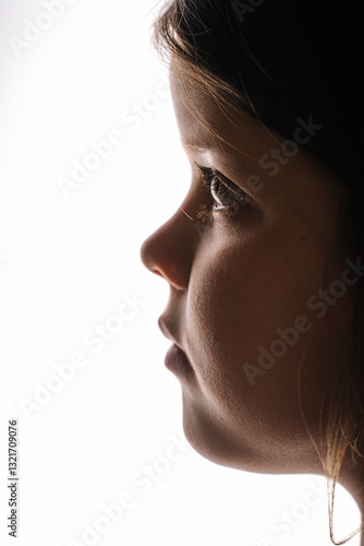 Close-up profile portrait of a young girl with soft lighting and a high-key background, emphasizing her facial features and thoughtful expression..