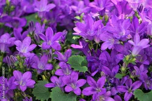 Closeup purple flowers of Dalmatian bellflower or Adria bellflower or Wall bellflower (Campanula portenschlagiana) background texture, Spring in Georgia USA.