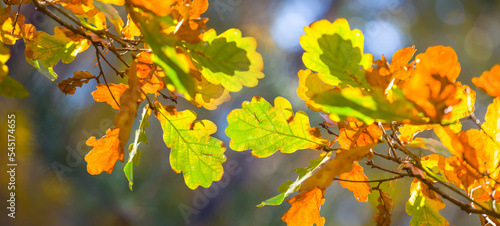 closeup red dry oak tree branch in forest, autumn outdoor background