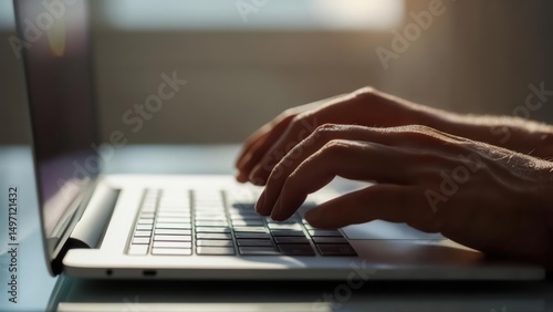 Close-up shot captures hands typing on a laptop keyboard bathed in warm, focused sunlight.