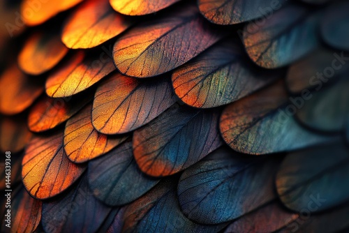 Close-up shot displaying overlapping scales that exhibit a gradient from gold to black with detailed textures and iridescent shimmer.
