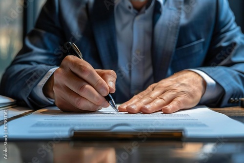 Close-up shot of a businessman signing a contract at his desk surrounded by legal documents and reports.