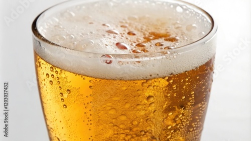 Close-up shot of a cold glass containing golden liquid with abundant foam, frothy, refreshment
