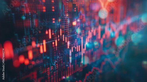 Close-up shot of a computer screen displaying colorful charts and graphs representing stock market data