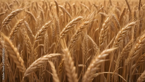Close-up shot of a field of wheat, focusing on the ripe, golden ears of grain