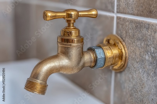 Close-up shot of a golden faucet mounted on a textured tiled wall, showcasing its intricate design and sturdy construction, reflecting cleanliness and modern bathroom style.