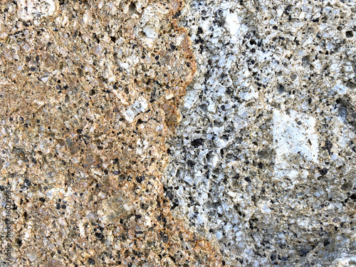 Close-up shot of a large rock with a gray and gold dividing beside the sea that has been eroded by the sea until it is beautiful for artwork or graphic design. wallpaper, background, or backdrop.