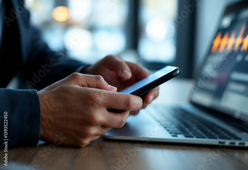 Close-up shot of a light-skinned man, around 30 years old, wearing a suit, using a smartphone with a five-star rating graphic above it