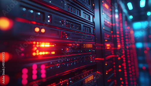 Close-Up Shot of a Server Rack in a Data Center with Bright Lights and Computer Equipment, Highlighting Advanced Technology Behind Cloud Services, Blurred Background, High Resolution