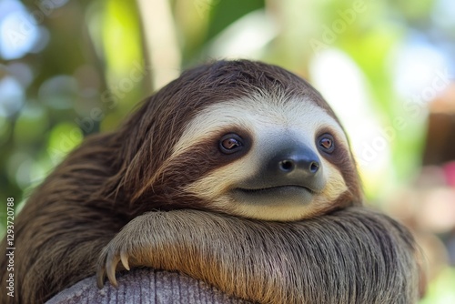 Close-up shot of a sloth hanging from a tree branch, looking relaxed