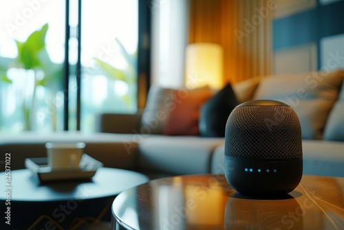 Closeup shot of a smart speaker in a modern living room, highlighting its voiceactivated functionality, technology tone, Splitcomplementary color scheme