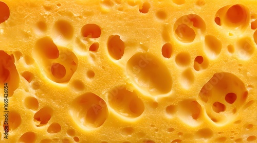 Close-up shot of a vibrant yellow cheese with numerous holes, creating an abstract pattern. The texture appears smooth and edible.