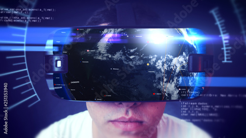 Close-up shot of a young man wearing VR Headset experiencing 3D virtual reality. Technology related digital earth network concept. 3D Rendering.