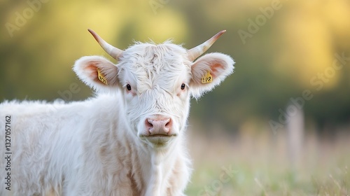 Closeup shot of a young white cow with ears marked for identification in a green pasture : Generative AI