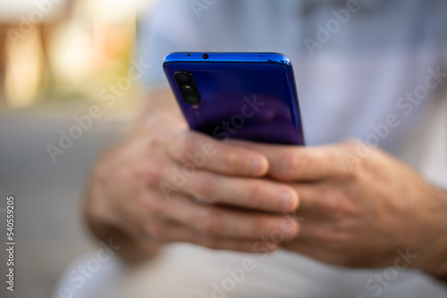 Closeup shot of an unrecognizable man holding mobile phone in hand, blurred background