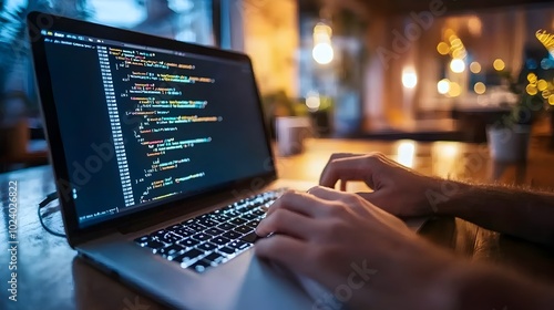 Closeup Shot of Focused Developer Typing Code on Laptop in a Dimly Lit Room Highlighting Productivity and Innovation in the Tech Industry