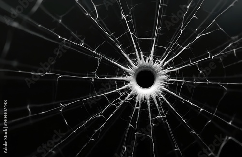Closeup shot of shattered glass. Bullet hole with cracks radiating outwards. Black background. Damage impact effect. Fracture pattern. Destruction concept. Violence crime scene.