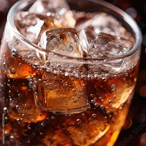 Close-up shot of Soda bubbles in a cola with ice in glass