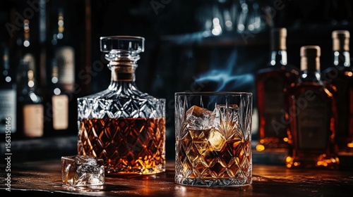 Close-up shot of whiskey bottle and glasses displayed on the bar counter