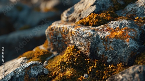 Close-up shows textured rocks covered in yellow-orange moss in soft, warm lighting