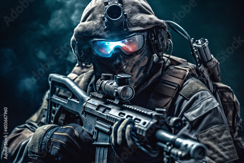 Close-up studio photo. elite unit, special forces soldier in camouflage uniform holding an assault rifle with a laser sight made with Generative AI