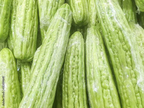 Closeup surface pile of fresh green bitter cucumber in plastic rap for sell textured background