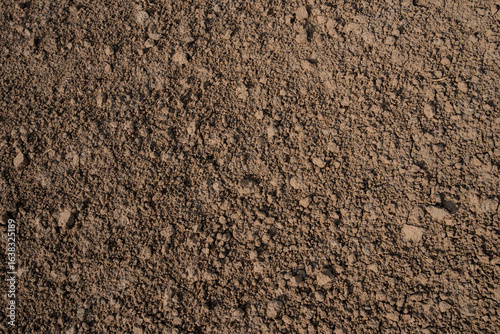 Close-up texture of dry cultivated soil with small clumps and granules, ideal for agricultural, gardening, and nature backgrounds