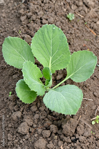closeup the ripe green cabbage plant with soil heap growing in the farm soft focus natural green brown background.