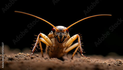 Close-up view of a brown cricket showcasing its intricate features and vibrant coloration, set against a dark background.