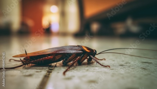 Close-up View of a Cockroach Crawling on a Tiled Indoor Floor, Representing Pest Control and Hygiene Issues in Urban Life : Generative AI