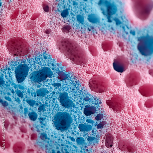 Close-up view of a colorful sponge showcasing intricate textures and patterns, highlighting the contrast between pink and blue sections, suitable for cleaning or artistic purposes