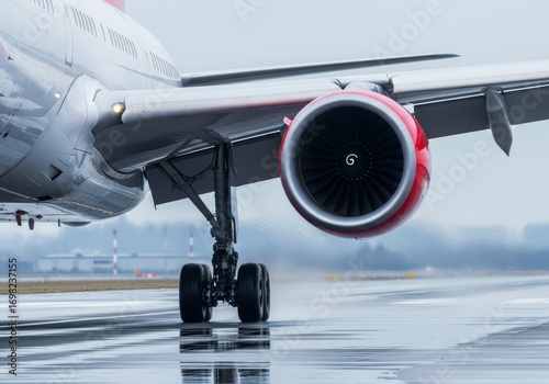 Close-up view of a commercial jet airplane's rear landing gear and engine on a wet airport runway during a rainy day
