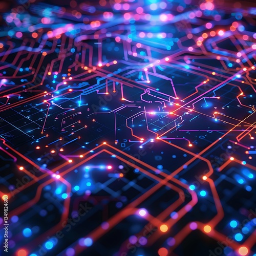Close-up view of a complex circuit board with glowing pink and blue neon pathways and data nodes. Futuristic technology and computer hardware concept background.