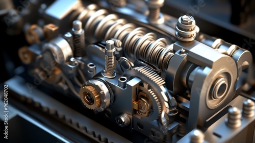 Close-up view of a complex mechanical engine component showcasing intricate gears and polished metal surfaces.