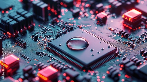 Close-up View of a Computer Circuit Board with Microchip, Red LEDs, and a Water Droplet Reflecting Light