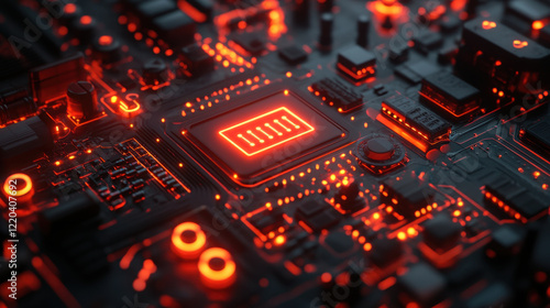 Close-up view of a dark circuit board with glowing orange components, highlighting a central chip and intricate electronic details.