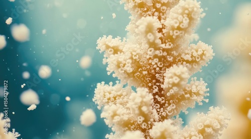 Close-up view of a delicate coral branch. A cluster of tiny, textured, pale beige polyps