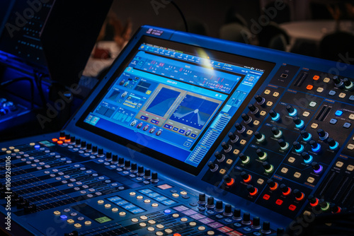 Close-up view of a digital audio mixing console featuring an interactive display and colorful LED-lit knobs. Ideal for sound engineering, music production, and live performance settings