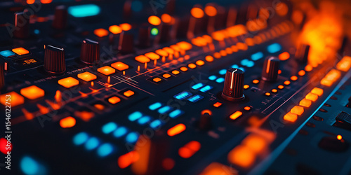 Close-up view of a DJ mixer console, with illuminated buttons and knobs glowing brightly in the dark.