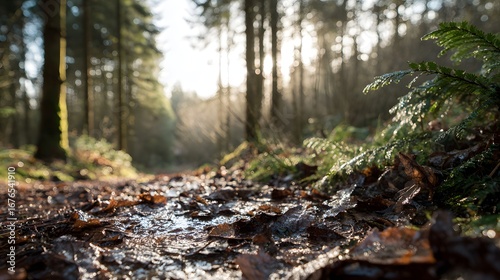 Close-up view of a forest path covered in fallen leaves and glistening with morning dew.