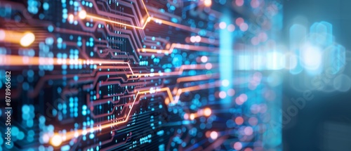 Close-up view of a futuristic circuit board with glowing lines and nodes, representing advanced technology and data processing.
