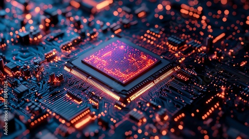 Close-up view of a glowing microchip circuit board, showcasing intricate electronic details.
