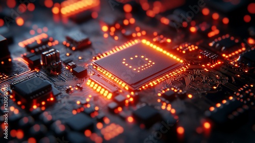 Close-up view of a glowing microchip on a circuit board with intricate connections