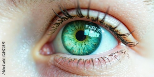 Close-up view of a human eye with striking green iris and dark eyelashes