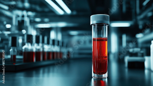 Close-up view of a laboratory test tube containing red liquid on a lab bench with blurred background, representing scientific research or experimentation.