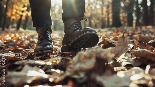 Close-up View of a Man Walking Through Vibrant Autumn Leaves in Enchanted Forest, Sunlight Filtering Through Majestic Trees with Fall Foliage