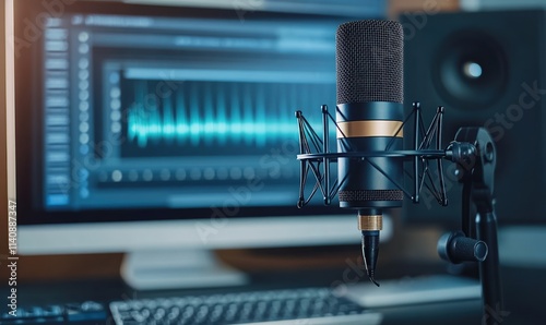 Close-up view of a microphone and audio waveform in a podcast studio highlighting audio editing technology
