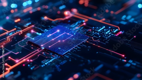 Close-up view of a modern computer chip on a circuit board with vibrant lighting effects in a tech environment