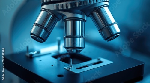 Close-up view of a modern microscope on a laboratory table, showcasing precision engineering and scientific exploration